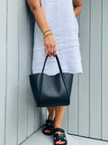 She’s a piped tote with a concealed zip inner section handmade from exquisite cow hide leather in Italy.